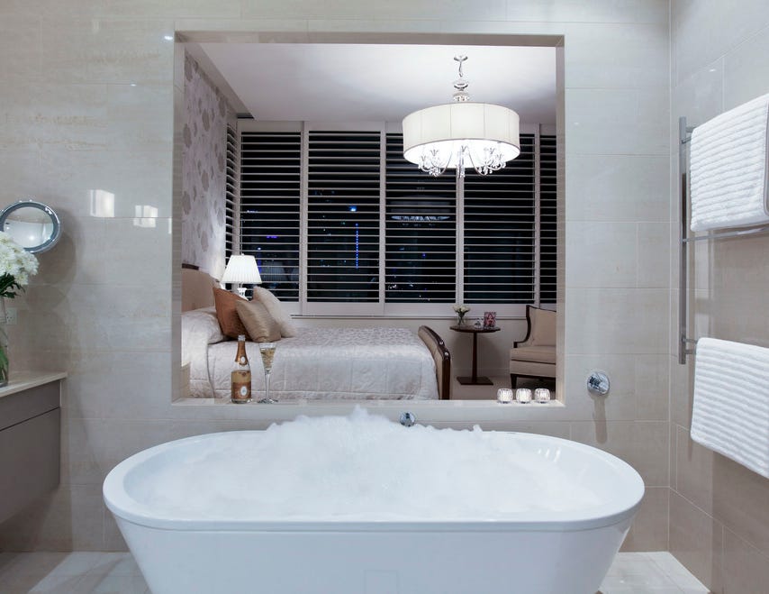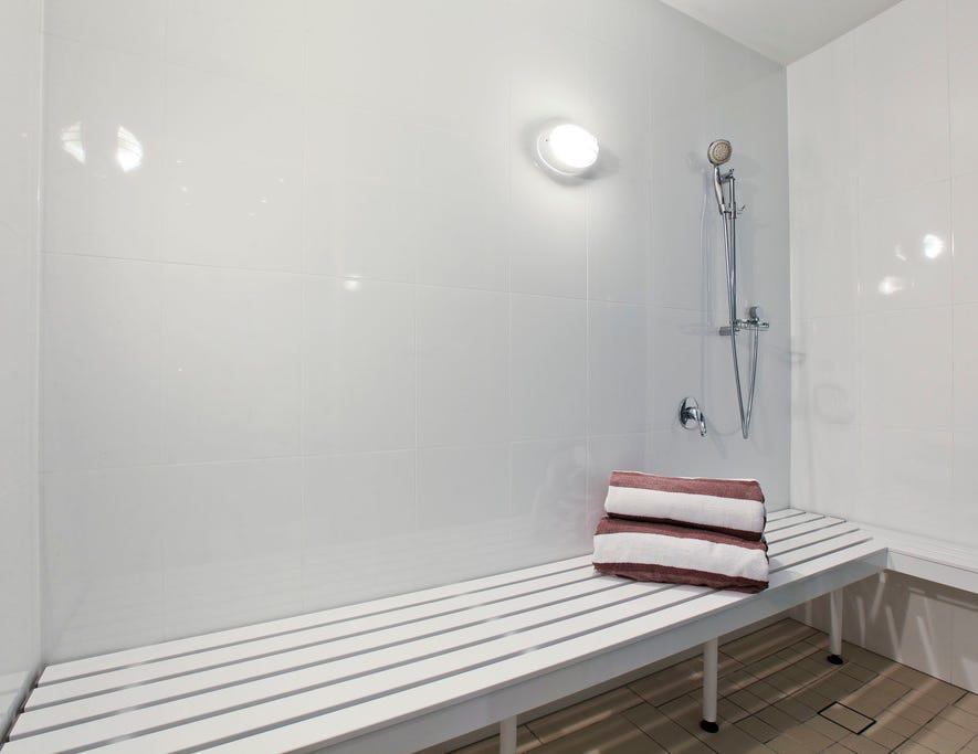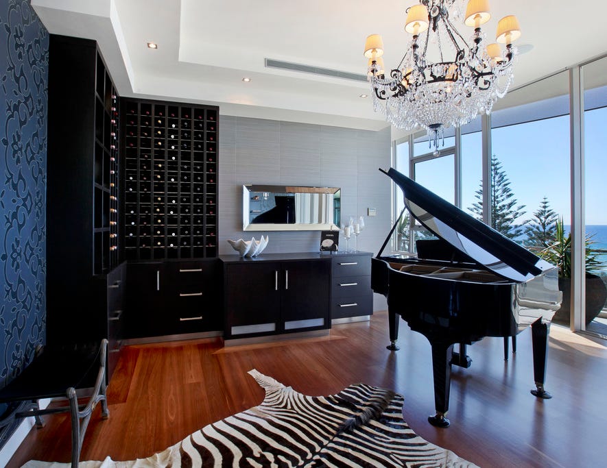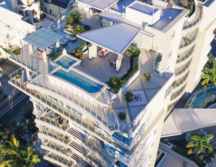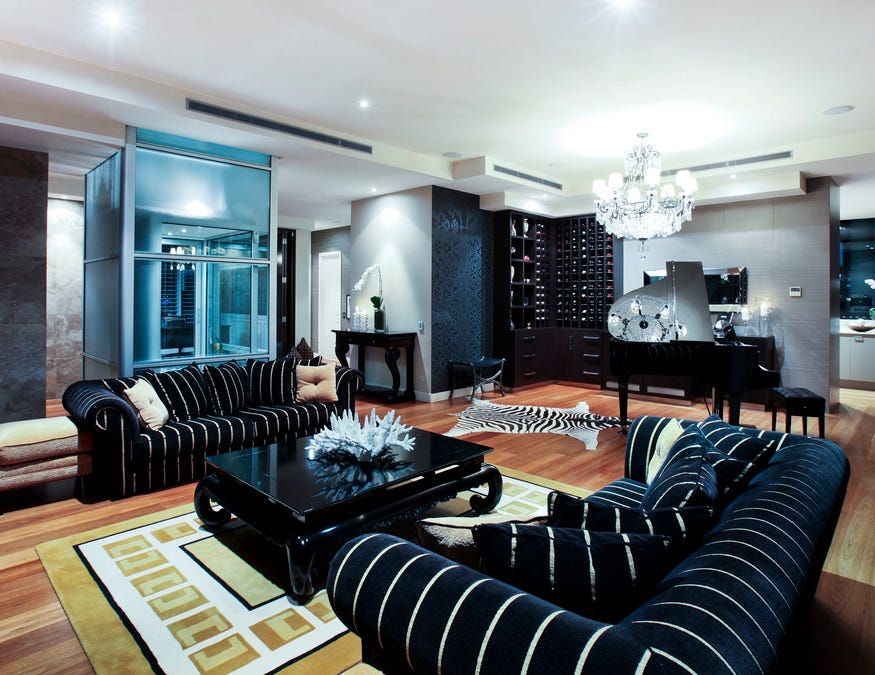 In addition to the 743m2 elegant house-sized residence, this rare property includes a vast rooftop garden, complete with lavish entertaining facilities, a lap pool, heated spa and steam room. From the private internal security elevator, one steps out onto a 370m2 terrace with planter gardens and a spacious outdoor conversation lounge beneath a dramatic skillion roof. Wide steps lead up to the pool with adjoining heated spa. On the ocean aspect is a