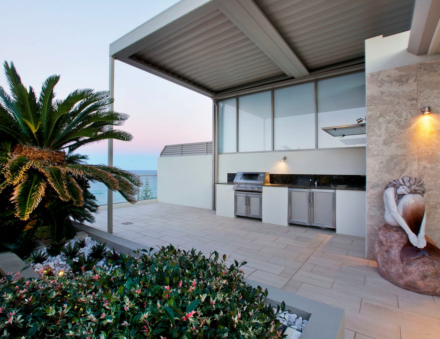 roofed dining area and large bbq kitchen. Frameless glass fencing ensures panoramic views in almost every direction, while the kitchen, bathroom, steam room and shower facilities provide comfort and convenience for the host and guests. Caressed by sea breezes and the warmth of the Queensland sun, this is the ultimate spot for relaxing in a private pampered environment.
