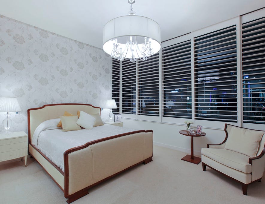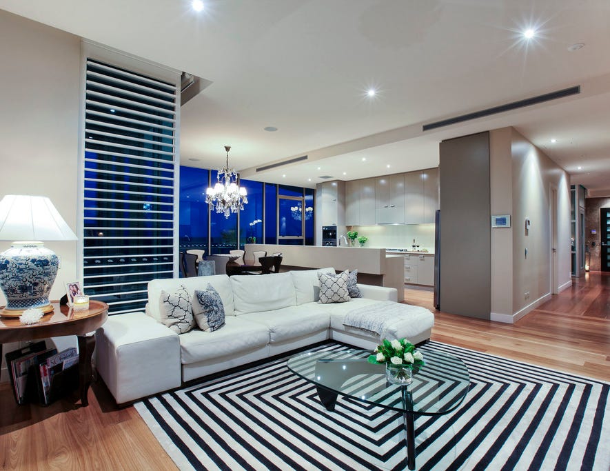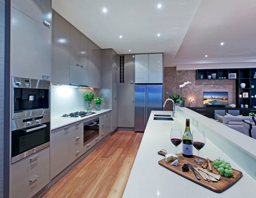 Boasting high ceilings throughout, three spacious bedrooms and a large separate study this penthouse apartment is the essence of contemporary elegance, featuring polished timber floors, crystal chandeliers and white plantation shutters. Soft neutral decor is enhanced by designer accents of high-fashion wallpapers and natural stone surfaces. The huge open plan living area includes formal lounge, family TV area, formal dining and elegant kitchen with a quartz stone island bench. Two of the three bedrooms feature ensuites and large custom built walk-in robes, while the large study or 4th bedroom has access to the guest bathroom. Floor to ceiling glass and wide balconies showcase sensational ocean, parkland and city views.