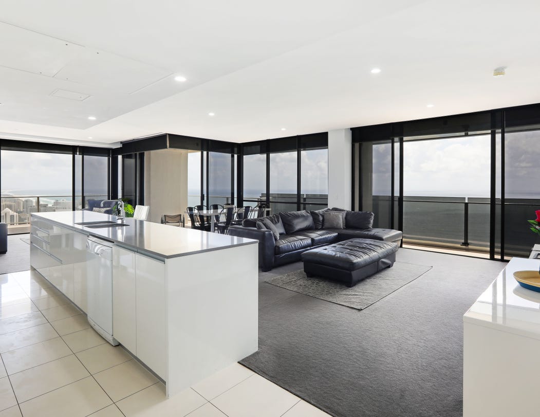 Perfectly positioned on the 54th floor of the prestigious Circle on Cavill building in Surfers Paradise, you’ll enjoy views from almost every room with this 3 bed, 2.5 bath elegant apartment. Boasting a light filled, spacious floorplan, you’ll be able to soak up Pacific Ocean vistas which sweep around to the hinterland from your wraparound deck as well as the roomy living areas. The gourmet kitchen comes complete with well-appointed appliances and ample cupboard space, with the bedrooms all generously sized. The master is also accented by a sumptuous spa in the ensuite, a walk-in-robe and wide water views.