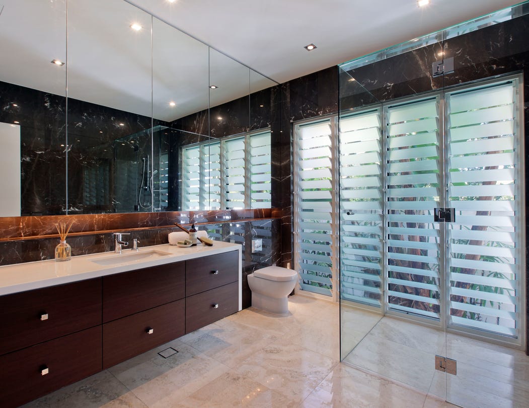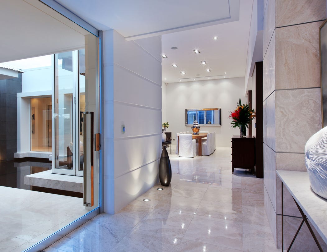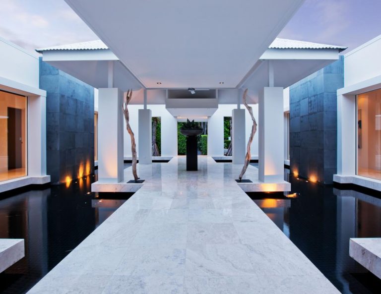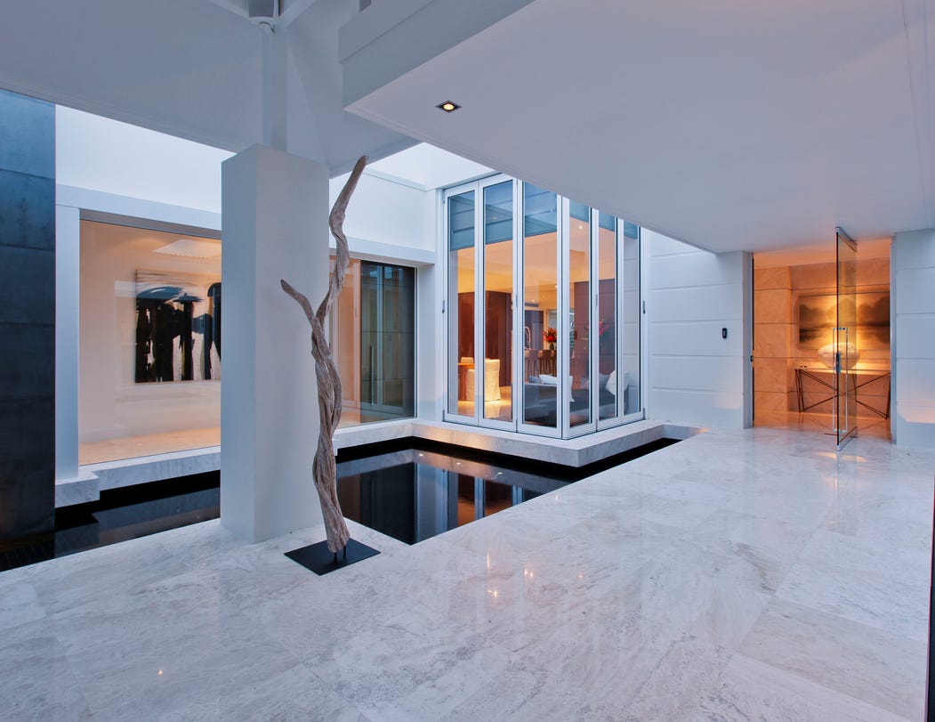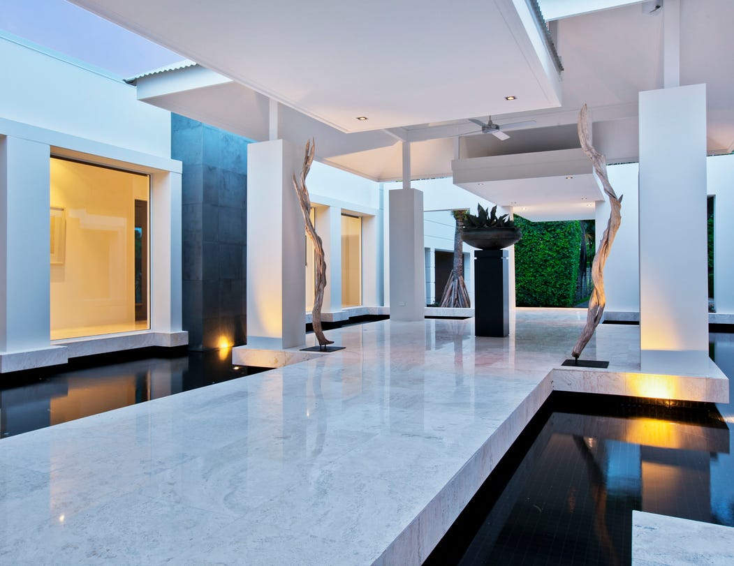 Immediately upon entering the manicured grounds, one quickly appreciates that this property is special. Concealed from the street beyond a long private driveway, the dramatic entry follows a broad marble catwalk surrounded by tiled reflection pools to the glass foyer.