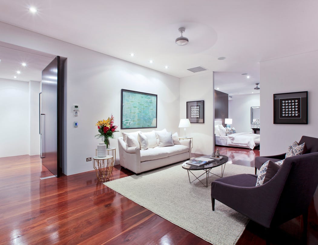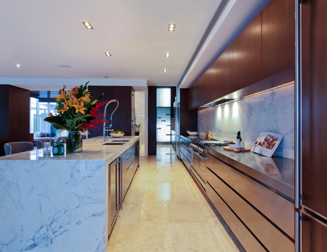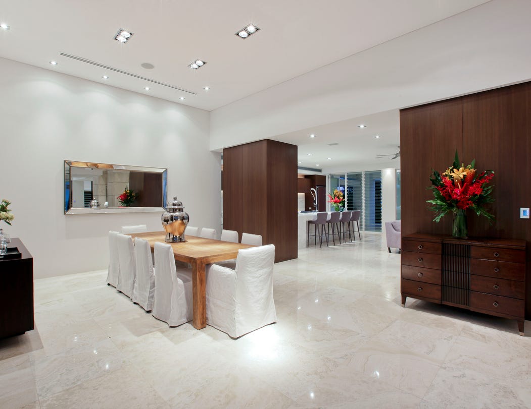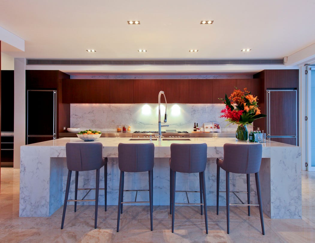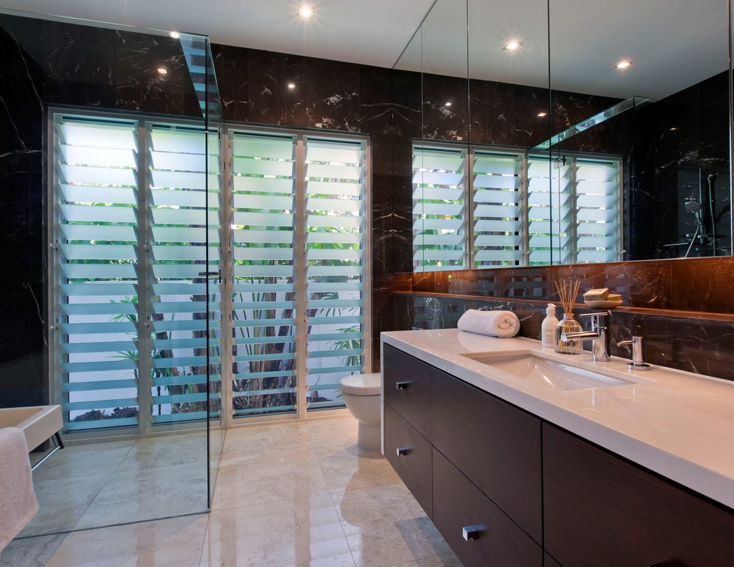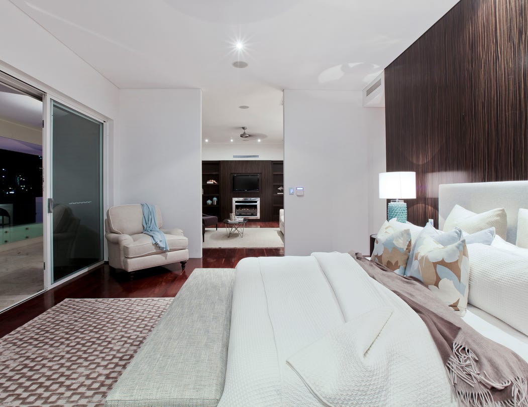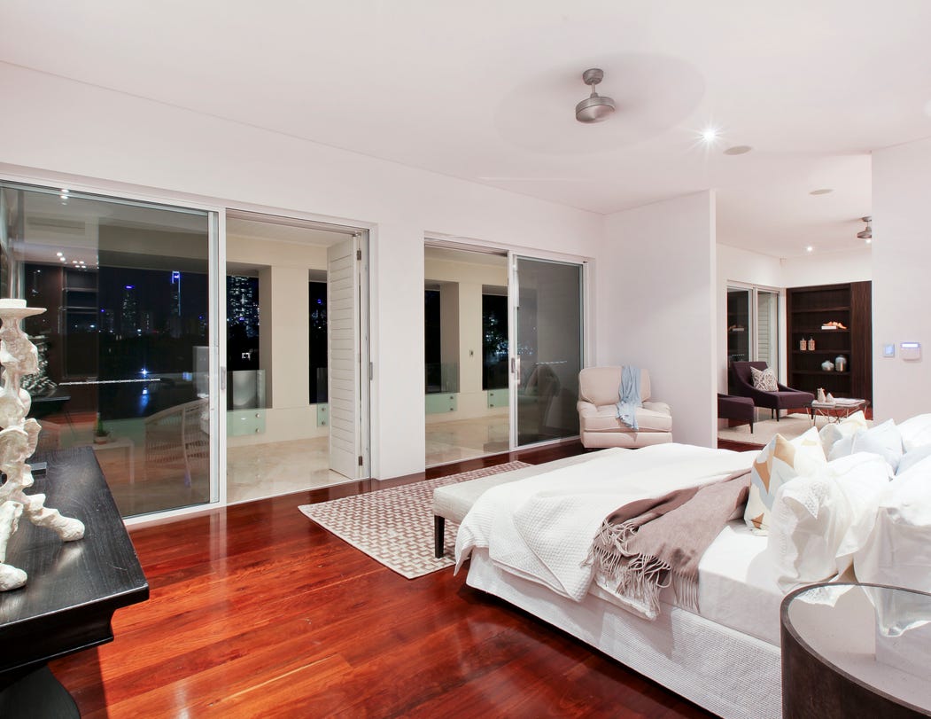 Perfectly situated on a North-facing broad stretch of the river, the main living areas and expansive entertaining terraces enjoy year-round sunshine, privacy and spectacular city skyline views. Large open living areas flow to the resort-style infinity pool and terrace flanked by twin dining pavilions. Floor to ceiling bi-fold glass doors and white plantation shutters offer the option of cool summer breezes or cosy privacy.