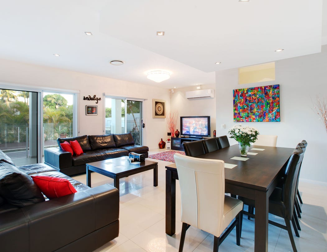 Fronting the tranquil waterways of Miami Keys is this immaculate dual-storey residence that occupies a central position in sought-after Broadbeach Waters. Italian porcelain floor tiles and Croatian glass chandeliers complement spacious, light-filled interiors including an open-plan living and dining area.