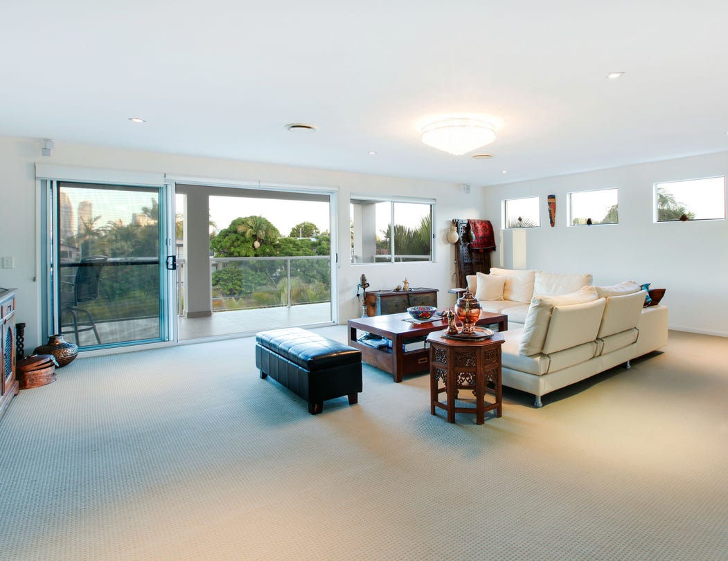 Upstairs, a generous multi-purpose room merges seamlessly beyond glass doors to a covered balcony where views extend across the water to the Broadbeach and Surfers Paradise skyline.