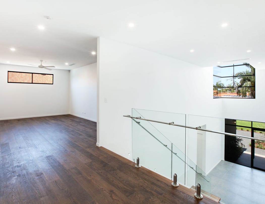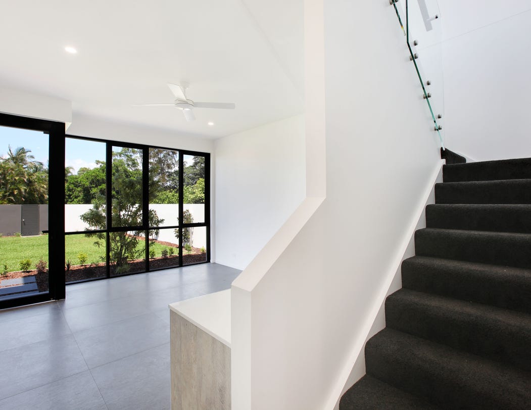 Wide timber stairs ascend through the 7m high foyer to an open rumpus room equipped with mirrored storage and a kitchenette with a sink, wine fridge and convection oven. The space is central to three generous bedrooms each with private bathrooms.