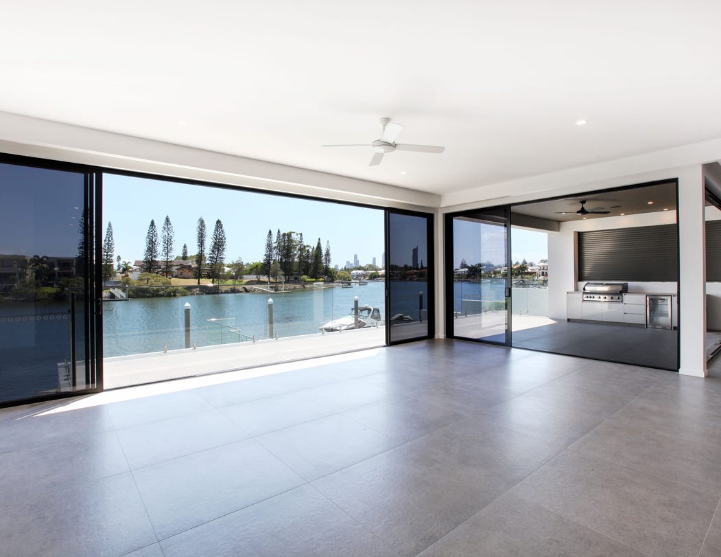 Three walls of mobile glass front the fluid lifestyle space – gliding back for seamless integration with an alfresco entertaining room with in-ceiling speakers, a ceiling fan and built-in barbecue kitchen with stone benches, a sink and beverage fridge.