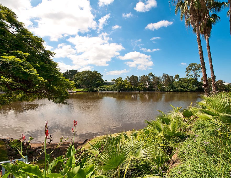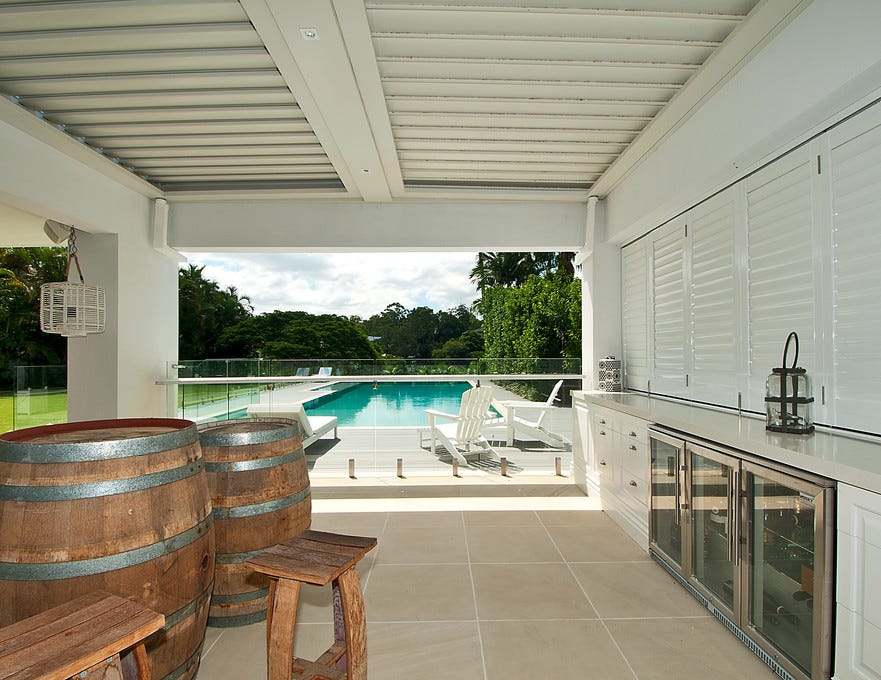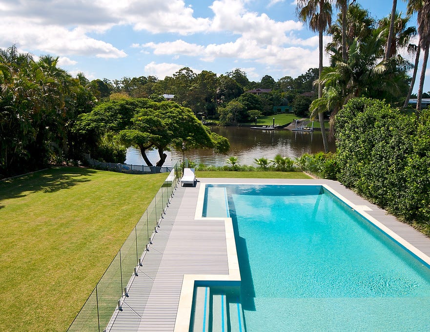Within the centre of the home is the gourmet Calacatta marble island kitchen and butlers pantry, showcasing high-end appliances including integrated fridges, steam oven, induction microwave, gas cooktop, as well as soft-close cabinetry. Sliding glass doors span the adjacent lounge area, full wet bar and study, inviting an effortless flow out to the expansive entertainment patio overlooking the swimming pool and tranquil riverfront. With numerous living and dining spaces, both formal and casual, along with a gym room and separate self-contained guest house, there is no shortage of space for entertaining and relaxing.